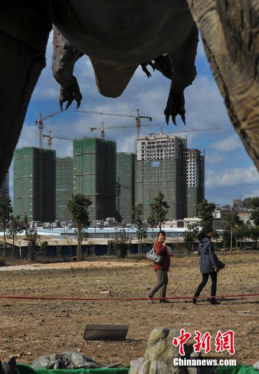 12月3日,昆明呈贡新区一空地上,20多只巨型恐龙模型群展吸引市民关注。图为形态各异的模型与周边的楼盘、建筑相印成趣。中新社发 任东 摄