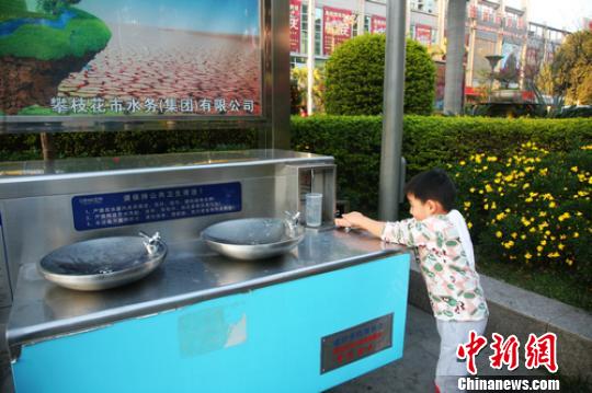 12月9日,四川省攀枝花市中心广场设置的免费直饮水平台,一位外地小朋友正在接水。高寒 摄