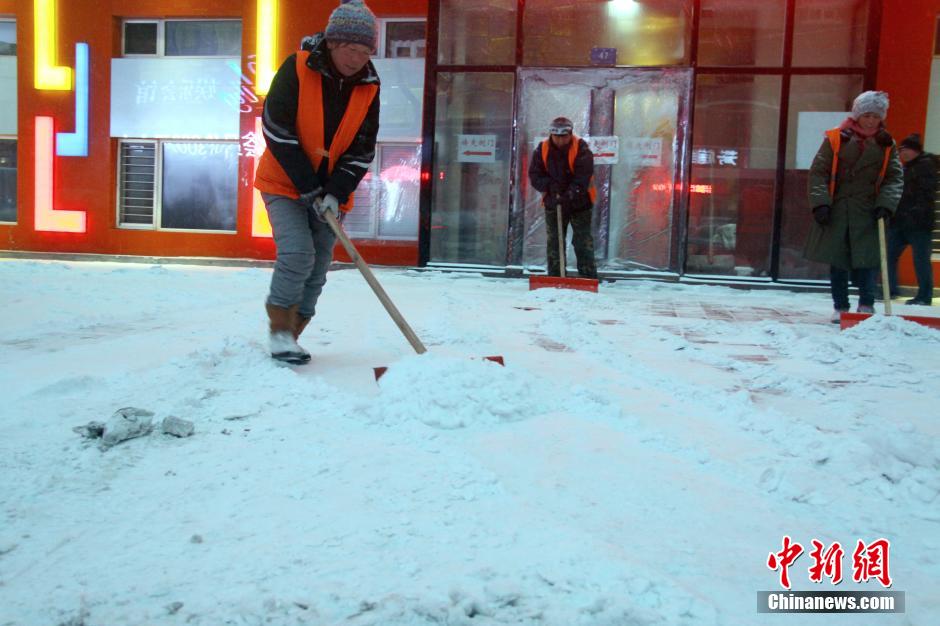 12月10日,受冷空气影响,中国最北省会哈尔滨市迎来今冬最大的一场降雪,黑龙江气象部门于当日发布暴雪蓝色警报,据介绍,本次降雪将会持续三天左右。图为环卫工人正在清扫人行道上的积雪。中新社发 王栋梁 摄