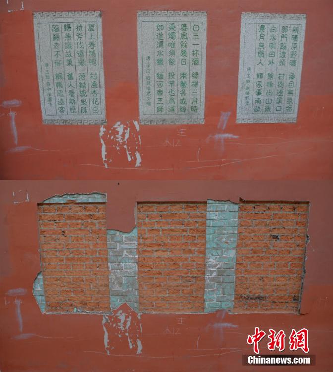 12月10日,山西太原桃园南路西里街,文化墙上的近百首唐诗全部被扒掉,露出成块的红色墙砖,被民众戏称为“砖框框”。9日晚,迎泽区城管局的工作人员连夜将墙上的近百首唐诗全部被扒掉,下一步将在原处补建新的古诗石刻,统一使用规范简体字。该文化墙上曾刻有近百首唐诗,繁体字错用竟有33处之多,被网友称为“尴尬文化墙”,引起社会热议。图为“尴尬文化墙”的前后对比图(拼图)。中新社发 武俊杰 摄