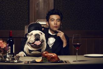 周董说,狗狗很重,穿着西装坐在腿上,就好像抱一个人一样。