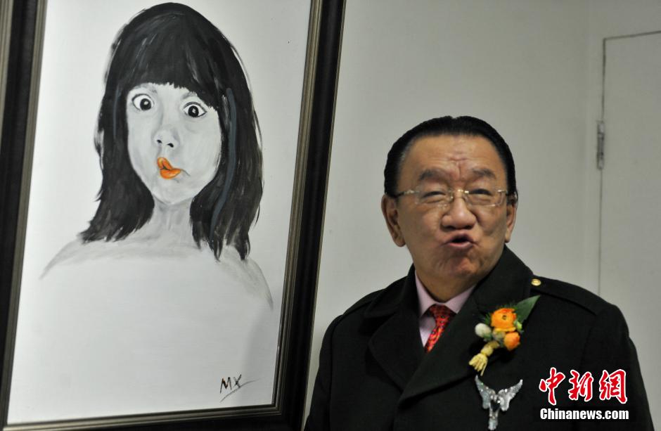 12月14日,侯耀华在一幅油画前学噘嘴。当日,“乘Feng逐雪”——85后浪漫主义画家王梦雪油画作品展在成都武侯祠美术馆开展,此次油画展的素材多数取材于四川甘孜藏区、俄罗斯等地。据悉,成都女孩王梦雪出生于1986年,曾在俄罗斯圣彼得堡国立大学留学,同时在俄罗斯列宾美术学院梅尔尼杰夫工作室进修。回国后曾就职四川文艺出版社,现为四川当代油画院专职画家。中新社发 刘忠俊 摄