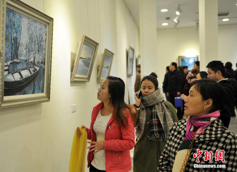 12月14日,油画《林中冬境》吸引参观者。当日,“乘Feng逐雪”——85后浪漫主义画家王梦雪油画作品展在成都武侯祠美术馆开展,此次油画展的素材多数取材于四川甘孜藏区、俄罗斯等地。据悉,成都女孩王梦雪出生于1986年,曾在俄罗斯圣彼得堡国立大学留学,同时在俄罗斯列宾美术学院梅尔尼杰夫工作室进修。回国后曾就职四川文艺出版社,现为四川当代油画院专职画家。中新社发 刘忠俊 摄