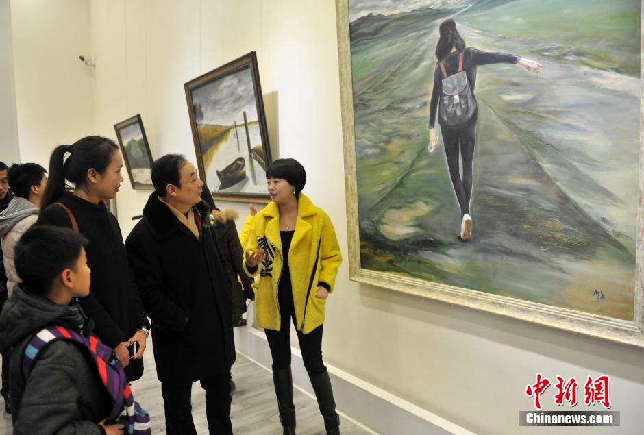 12月14日,王梦雪(右一)向参观者介绍创作过程。当日,“乘Feng逐雪”——85后浪漫主义画家王梦雪油画作品展在成都武侯祠美术馆开展,此次油画展的素材多数取材于四川甘孜藏区、俄罗斯等地。据悉,成都女孩王梦雪出生于1986年,曾在俄罗斯圣彼得堡国立大学留学,同时在俄罗斯列宾美术学院梅尔尼杰夫工作室进修。回国后曾就职四川文艺出版社,现为四川当代油画院专职画家。中新社发 刘忠俊 摄