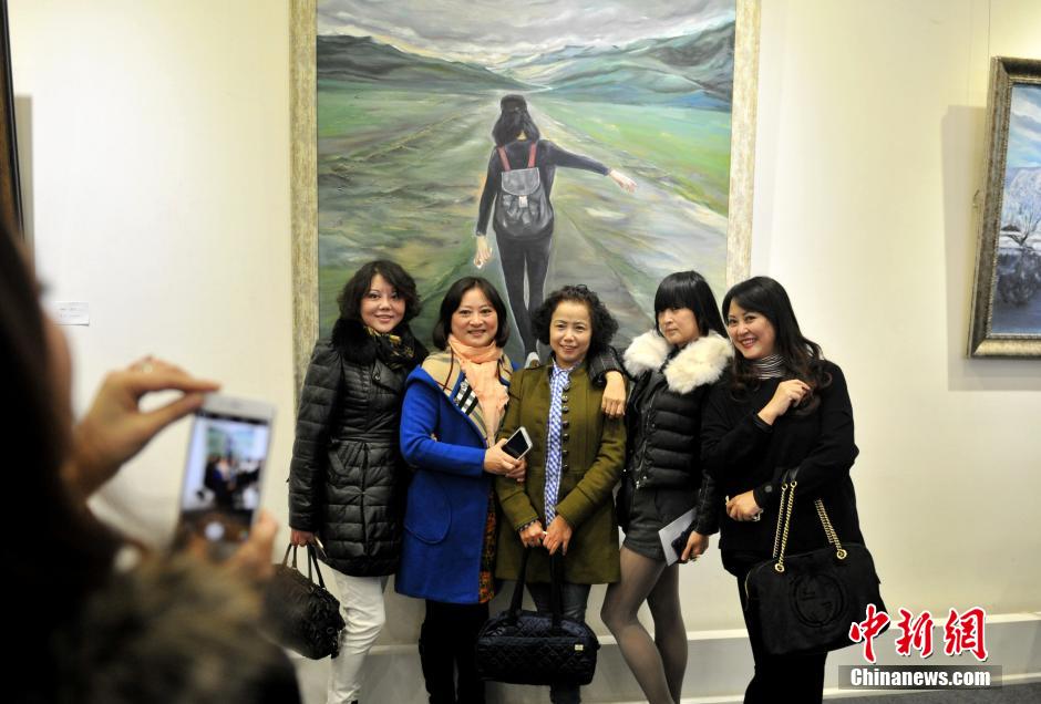 12月14日,一群观展者在油画展上拍照留念。当日,“乘Feng逐雪”——85后浪漫主义画家王梦雪油画作品展在成都武侯祠美术馆开展,此次油画展的素材多数取材于四川甘孜藏区、俄罗斯等地。据悉,成都女孩王梦雪出生于1986年,曾在俄罗斯圣彼得堡国立大学留学,同时在俄罗斯列宾美术学院梅尔尼杰夫工作室进修。回国后曾就职四川文艺出版社,现为四川当代油画院专职画家。中新社发 刘忠俊 摄
