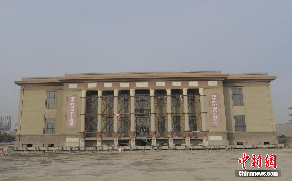 12月14日,山西大同,经过两年多工程作业的大同展览馆已全部平移到位。建于1969年的大同市展览馆,总建筑面积1.8万平方米,2012年,大同启动古城保护修复计划,在展开西城墙修复工程时,因展览馆处于古城西城墙轴线及瓮城的修复范围内,为同时兼顾名城保护与历史建筑保护,大同市政府广泛征集专家、市民意见,并进行科学论证,最终确定对这一地标建筑进行保护性整体平移。平移到位的大同展览馆累计平移直线距离约为1402米(不含旋转位移),并分别旋转90°,迁移总重量(含托盘结构)约57768吨。中新社发 武俊杰 摄