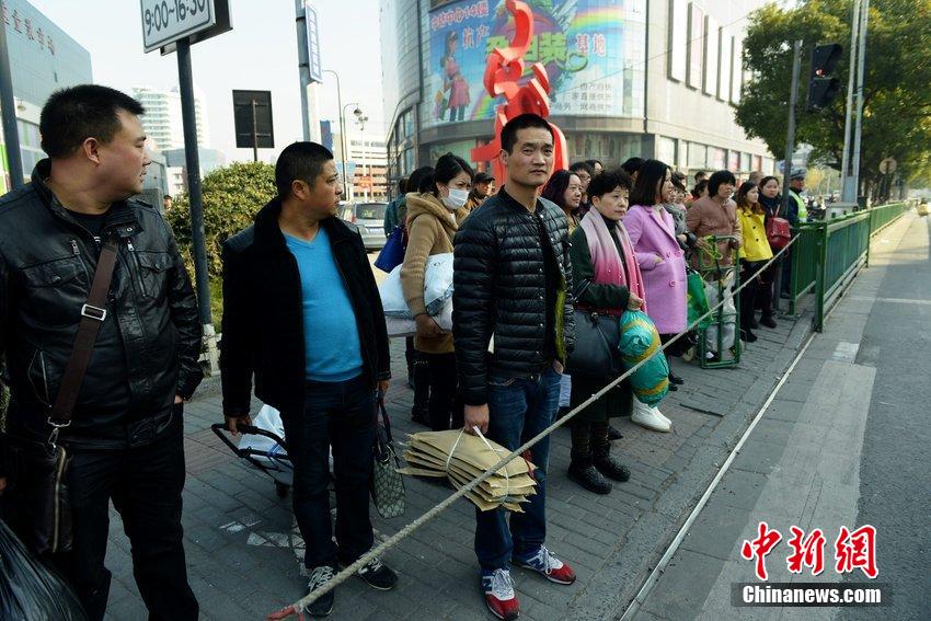 2014年12月14日,浙江省杭州市,在杭州解放东路四季青中纺服装城路口,行人在拉起的绳子后面等待。
