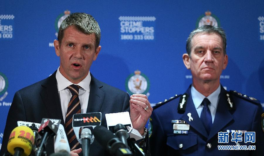 12月16日,在澳大利亚悉尼,新南威尔士州州长迈克·贝尔德(左)、警察局长安德鲁·西皮奥内出席新闻发布会。澳大利亚新南威尔士州警方16日5时30分召开新闻发布会,宣布解救悉尼马丁广场被劫持人质的“行动结束”,持续近17小时的人质事件造成包括劫持者在内的3人死亡、4人受伤。新华社/美联