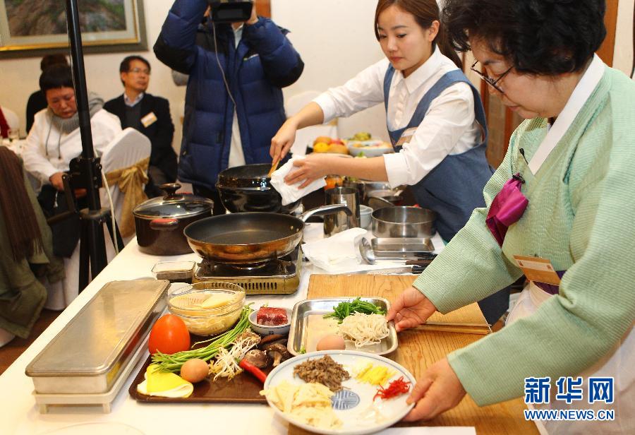 12月15日,在韩国首尔,“朝鲜王朝宫中饮食”非物质文化传承人韩福丽(右一)制作宫廷料理。
