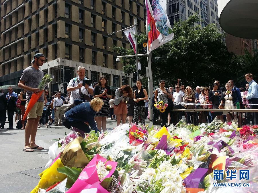 12月16日,在澳大利亚悉尼,人们在发生人质劫持事件的咖啡店前献花,悼念遇难者。澳大利亚警察16日凌晨冲入悉尼马丁广场发生人质劫持事件的咖啡馆,与劫持者交火。警方随后宣布“行动结束”,持续近17小时的人质事件告一段落。此次人质事件共造成包括劫持者在内的3人死亡、4人受伤。新华社记者金林鹏摄