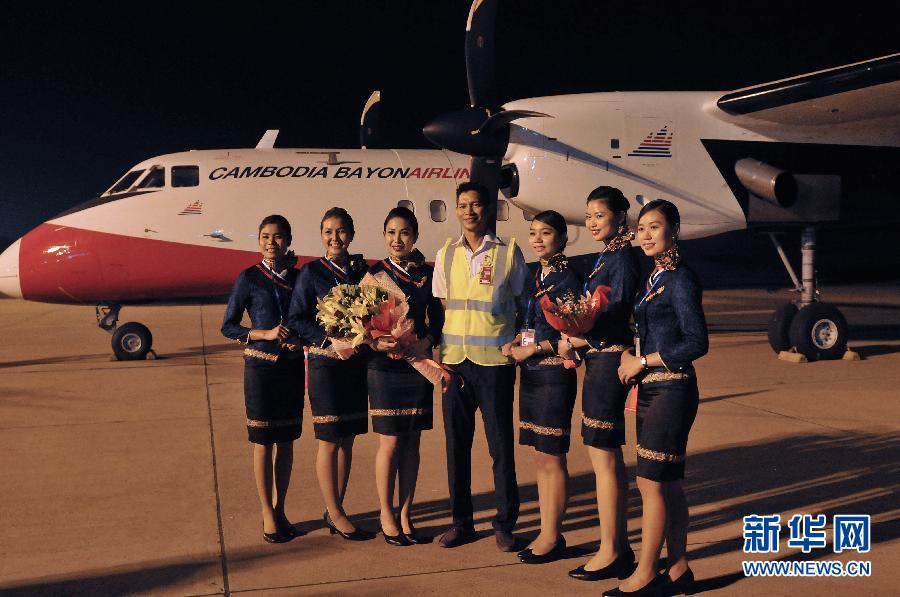 12月15日,在柬埔寨首都金边国际机场,巴戎航空工作人员在新舟60飞机前合影留念。柬埔寨巴戎航空有限公司首架全新新舟60飞机15日晚平稳降落在柬埔寨首都金边国际机场,巴戎航空在机场举行了盛大的接机仪式。新华社记者李弘摄