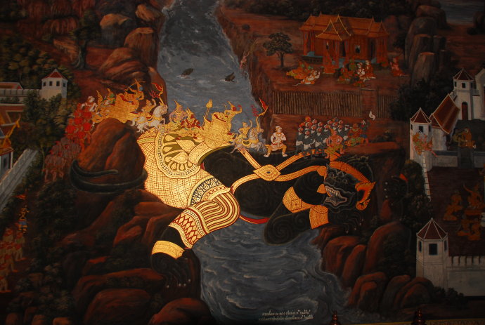 据悉,大皇宫壁画长廊约1000米长,绘有178幅以印度诗史《罗摩衍那》为题材的壁画,是世界上最长的壁画。每年泰国政府都要派专业画家修补,并给人物添上金粉。