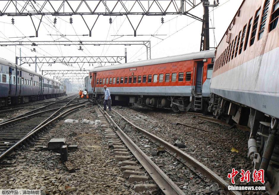 当地时间2014年12月14日,印度加尔各答, Liluah车站的工作人员将脱轨的火车车厢搬回铁轨。一名铁路官员称,当日该趟客运火车在离开Howrah车站不久就发生车厢脱轨,暂无伤亡报道。