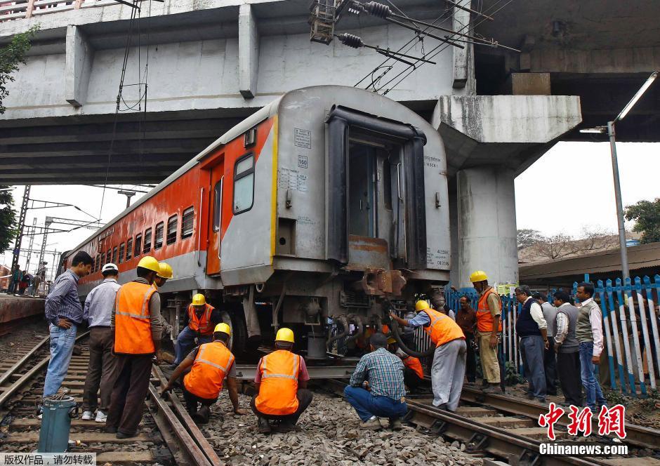 当地时间2014年12月14日,印度加尔各答, Liluah车站的工作人员将脱轨的火车车厢搬回铁轨。一名铁路官员称,当日该趟客运火车在离开Howrah车站不久就发生车厢脱轨,暂无伤亡报道。
