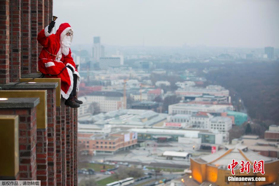 当地时间2014年12月14日,德国柏林,波茨坦广场的克尔霍夫大楼外上演杂技舞蹈秀,一名身穿圣诞老人服饰的男子爬上百米高楼。