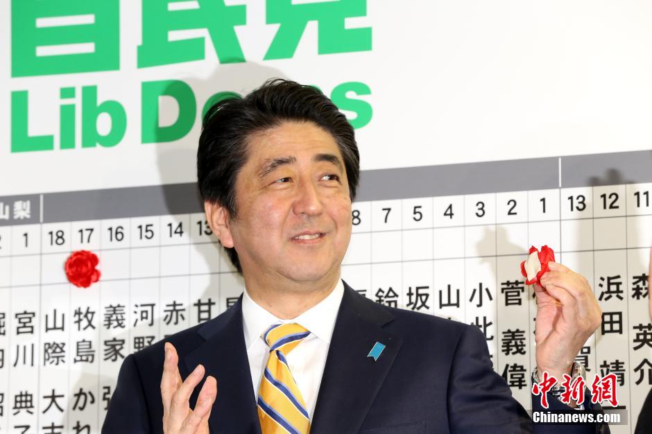 由首相安倍突然解散国会而提前引发的日本第47届众议院选举,12月14日晚间开票后早早见出分晓:联合执政的自民、公明两党,已在总计475个议席中很快超出300议席,早早确定胜势。仅自民党一家所获席位,便已超出能够主导国会运行的“安定多数”(266席)。图为安倍晋三在自民党本部设置的开票榜前。 中新社发 高越 摄