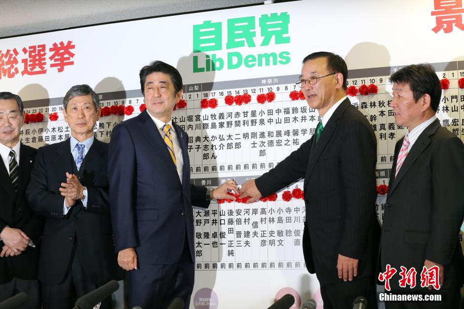 由首相安倍突然解散国会而提前引发的日本第47届众议院选举,12月14日晚间开票后早早见出分晓:联合执政的自民、公明两党,已在总计475个议席中很快超出300议席,早早确定胜势。仅自民党一家所获席位,便已超出能够主导国会运行的“安定多数”(266席)。图为在自民党本部设置的开票榜前,安倍晋三为自己的名字挂上确定当选的红花。 中新社发 高越 摄