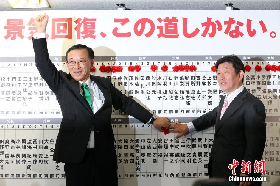 由首相安倍突然解散国会而提前引发的日本第47届众议院选举,12月14日晚间开票后早早见出分晓:联合执政的自民、公明两党,已在总计475个议席中很快超出300议席,早早确定胜势。仅自民党一家所获席位,便已超出能够主导国会运行的“安定多数”(266席)。图为在自民党本部设置的开票榜前,该党干事长谷垣祯一(图左)为自己的名字挂上确定当选的红花。 中新社发 高越 摄