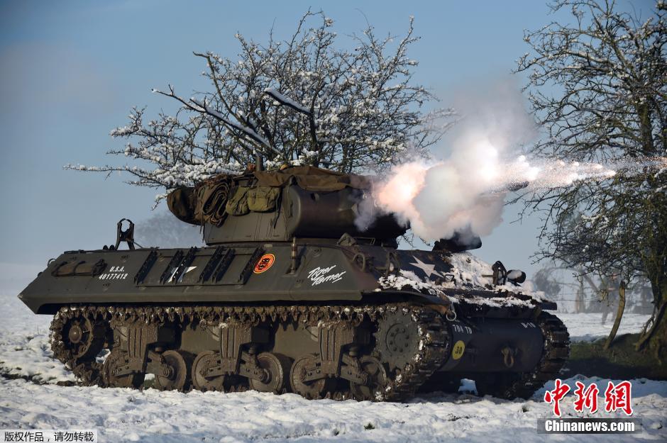 当地时间12月14日,比利时阿登地区,美国和比利时的演员身着二战时期的陆军军装重新了二战历史上最为血腥的战役——阿登战役。