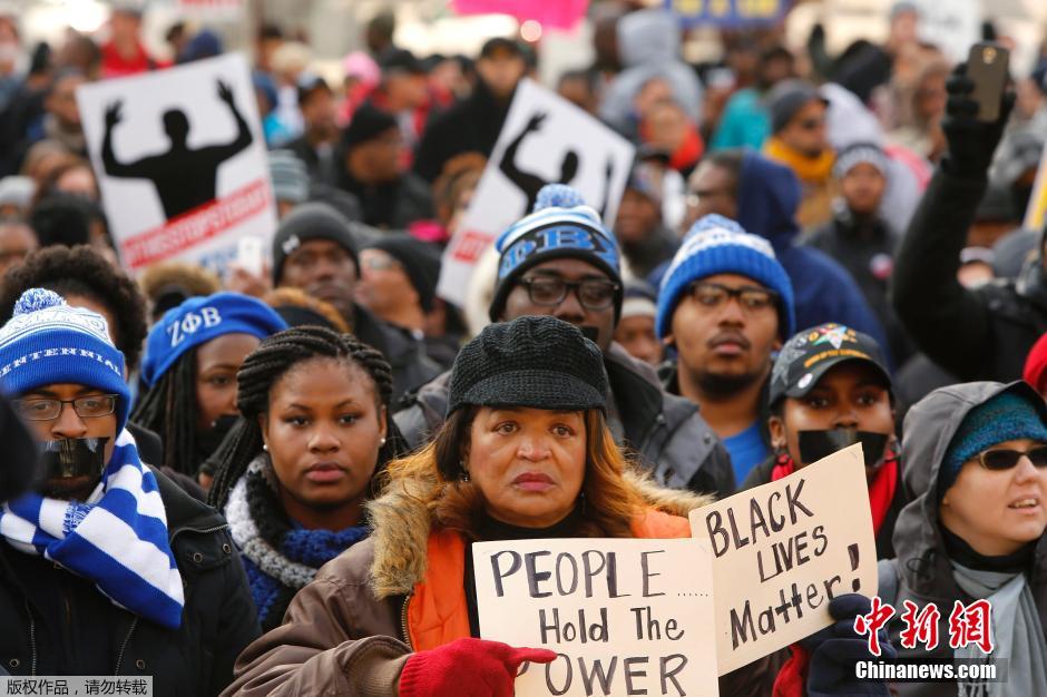 据外媒报道,13日,美国首都华盛顿特区、纽约以及波士顿等城市爆发示威游行,美国民众呼吁各界关注最近被警察打死的手无寸铁的黑人平民。图为美国民众在华盛顿示威游行。