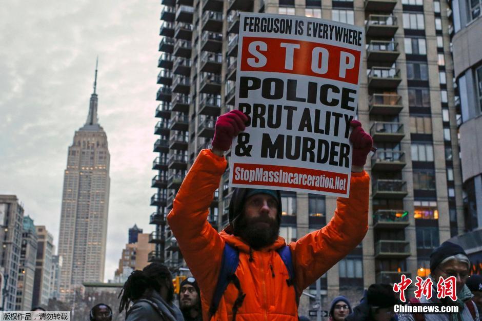 据外媒报道,13日,美国首都华盛顿特区、纽约以及波士顿等城市爆发示威游行,美国民众呼吁各界关注最近被警察打死的手无寸铁的黑人平民。图为美国民众在纽约示威游行。