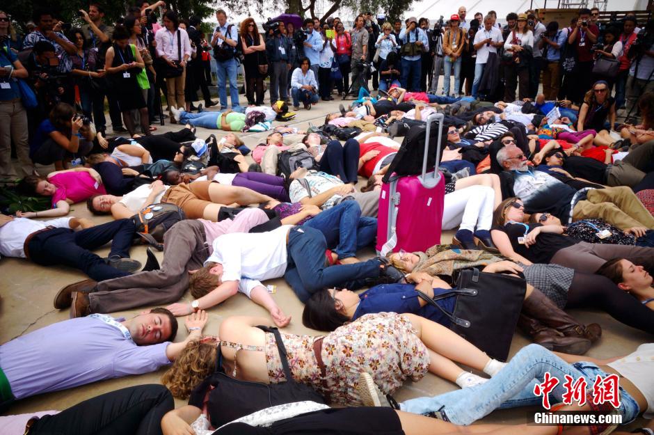当地时间12月12日上午,来自不同国家的数十名环保人士横卧在利马气候大会会场地面上,集体抗议气候谈判与应对气候变化行动进展迟缓。当天,利马气候大会已进入会期最后一日,但关键进展仍未显露。中新社发 彭大伟 摄