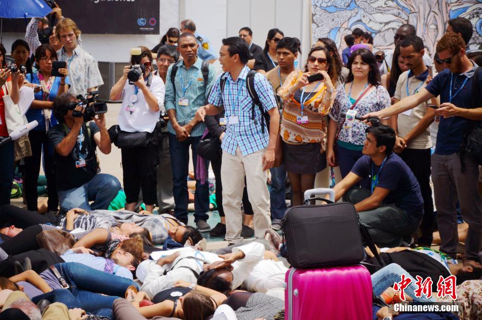 当地时间12月12日上午,菲律宾NGO“气候公正行动”官员Gerard C. Arances在利马气候大会会场大声控诉气候变化恶果造成菲律宾连年遭受严重台风侵袭,生灵涂炭。当天,利马气候大会已进入会期最后一日,但关键进展仍未显露,来自不同国家的数十名环保人士横卧在会场地面上,集体抗议气候谈判与应对气候变化行动进展迟缓。中新社发 彭大伟 摄
