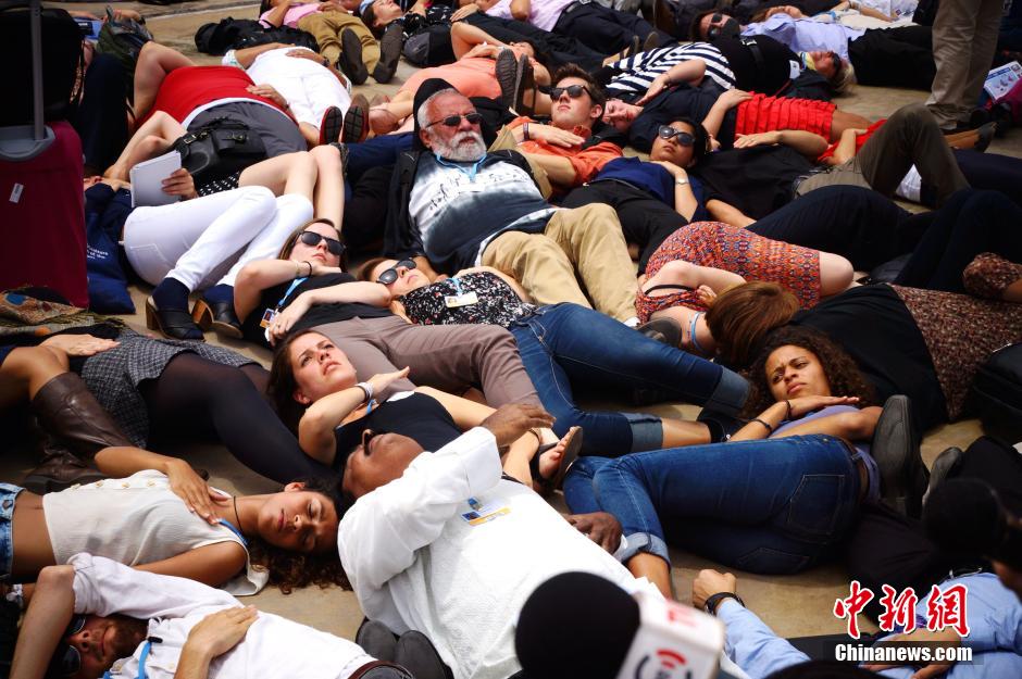当地时间12月12日上午,来自不同国家的数十名环保人士横卧在利马气候大会会场地面上,集体抗议气候谈判与应对气候变化行动进展迟缓。当天,利马气候大会已进入会期最后一日,但关键进展仍未显露。中新社发 彭大伟 摄
