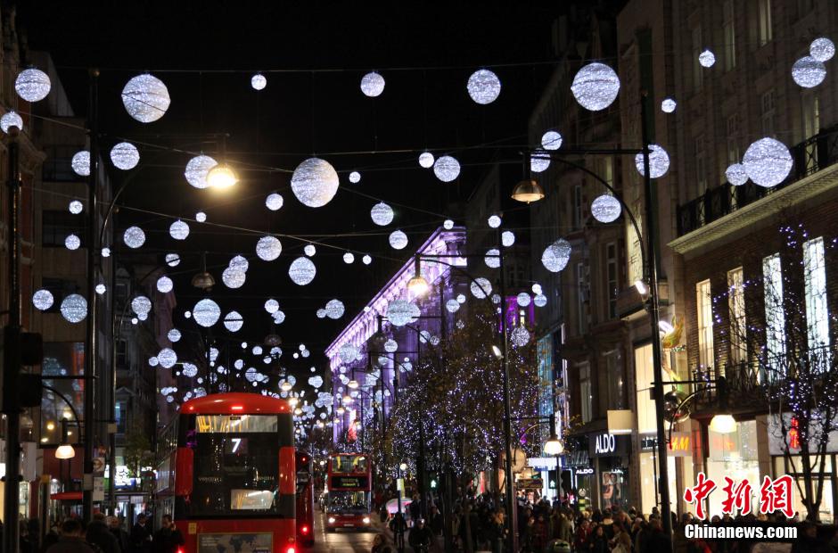 圣诞节即将来临,英国伦敦市中心的各条主要街道都悬挂起色彩斑斓、造型各异的灯饰,让来自世界各地的游客提前感受到浓浓的节日氛围。中新社发 周兆军 摄