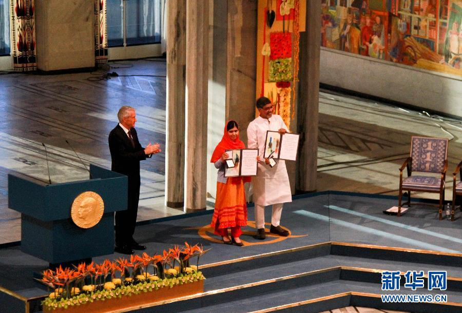 12月10日,在挪威奥斯陆,2014年诺贝尔和平奖得主凯拉什·萨蒂亚尔蒂(右一)和玛拉拉·尤萨夫扎伊(右二)展示奖章和证书。当日,2014年诺贝尔和平奖颁奖典礼在挪威奥斯陆举行。10月10日,挪威诺贝尔委员会主席托尓比约恩·亚格兰宣布,把2014年诺贝尔和平奖授予印度和巴基斯坦的儿童权利活动人士凯拉什·萨蒂亚尔蒂和玛拉拉·尤萨夫扎伊,以表彰他们反对压制儿童和青少年、为所有儿童争取教育权所进行的斗争。新华社记者刘敏摄 图片来源:新华网