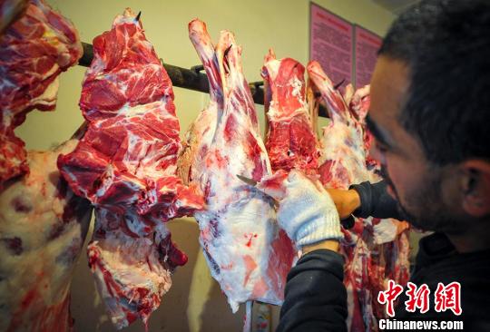 12月16日一大早,新疆乌鲁木齐市7坊街创意产业集聚区附件的一家牛羊肉商铺内,维吾尔族商贩艾尼瓦尔正在整理刚刚上架的新鲜羊肉,等待顾客光临购买。据艾尼瓦尔介绍,他的羊肉价格每公斤在50至56元不等,与去年相比下降的10元左右。自2006年开始,新疆牛羊肉价格一路飙升,7年间增长了2.8倍,2014年2月出现拐点。在新疆部分牧区,去年一只羊能卖1200元左右,今年只能卖到700元左右。因为价格低、销售难,今年新疆部分牧区的肉羊出栏率也下降了10%左右。