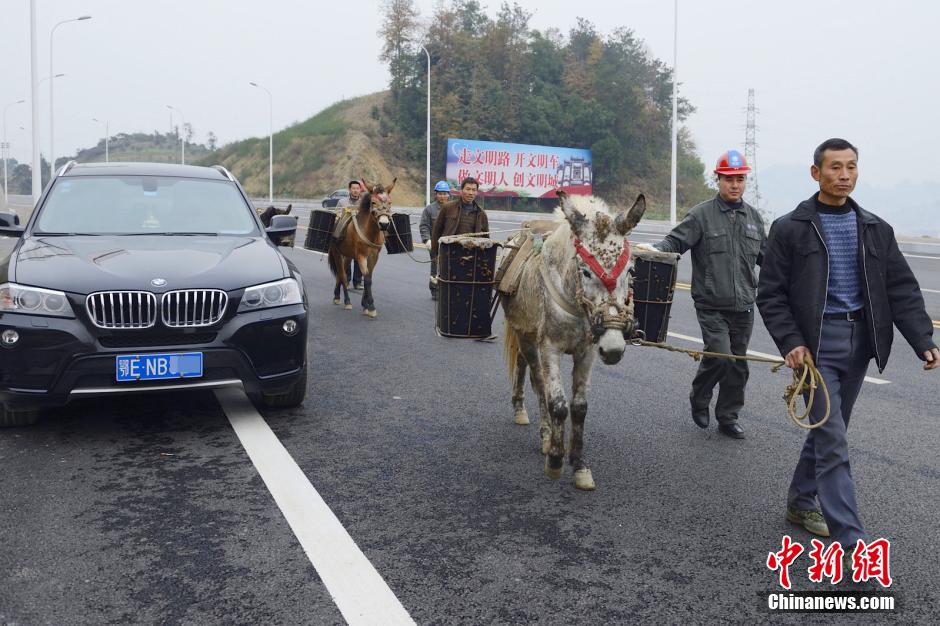 图为轿车和“马帮”运输队相映成趣。 王康明 摄
