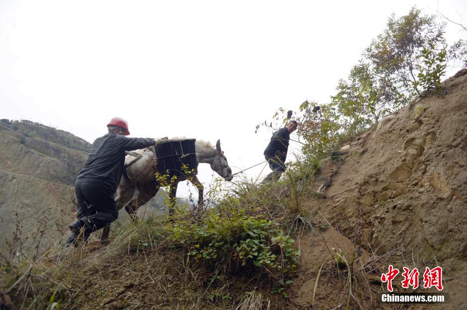 图为队员和骡马前拉后推爬上陡坡。 王康明 摄