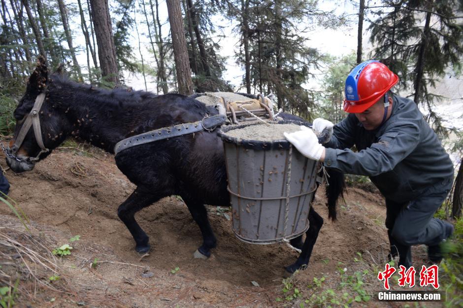 图为每匹骡马能托运200公斤砂石料。 王康明 摄
