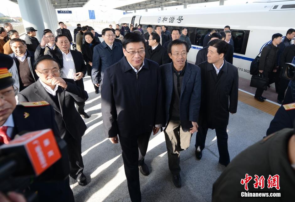 12月16日上午,G6409次长沙南站至怀化南站的高铁列车驶出车站。当日,沪昆高铁长沙以西湖南段正式开通运营,这标志着全长约496公里的沪昆高铁湖南段已全线贯通。图为湖南省委书记徐守盛(左二)体验首列从长沙南站开往怀化南站的高铁列车。 杨华峰 摄