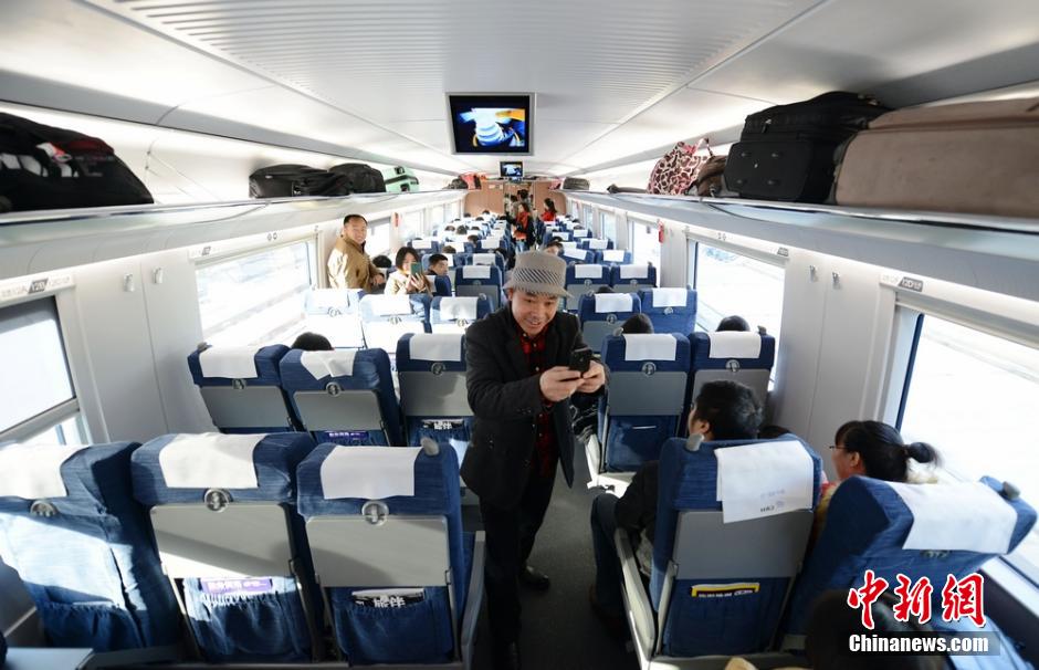 12月16日上午,G6409次长沙南站至怀化南站的高铁列车驶出车站。当日,沪昆高铁长沙以西湖南段正式开通运营,这标志着全长约496公里的沪昆高铁湖南段已全线贯通。图为一位乘客在车内拍照留念。 杨华峰 摄