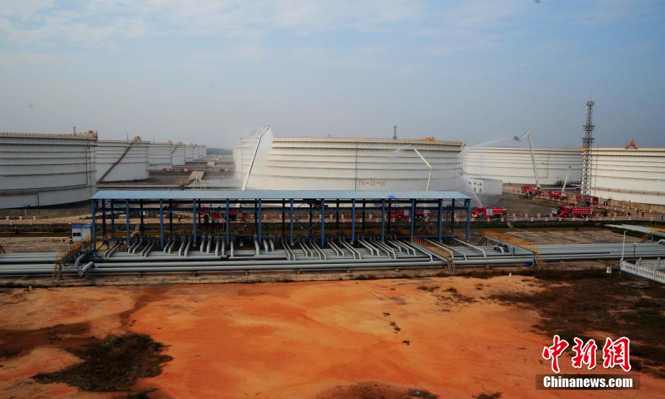 12月16日,广西北海市消防支队联合中石化北海炼化公司开展石油化工大型联合灭火演练,先后投入5个现役消防中队和中石化北海炼化公司专职消防队15辆消防车、85名消防官兵和专职队员进行联合作战。演练过程中,一道彩虹出现在空中与水柱交相辉映。李海华 摄