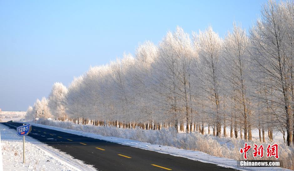 内蒙古呼伦贝尔多地气温降至零下35摄氏度以下,其中图里河今早6时最低气温降至零下40摄氏度。由于气温骤降,多地出现雾凇美景,尤其是公路两边的雾凇晶莹剔透,车辆穿行而过,犹如童话世界。这是12月16日在内蒙古呼伦贝尔拍摄的雾凇美景。中新社发 余昌军 摄