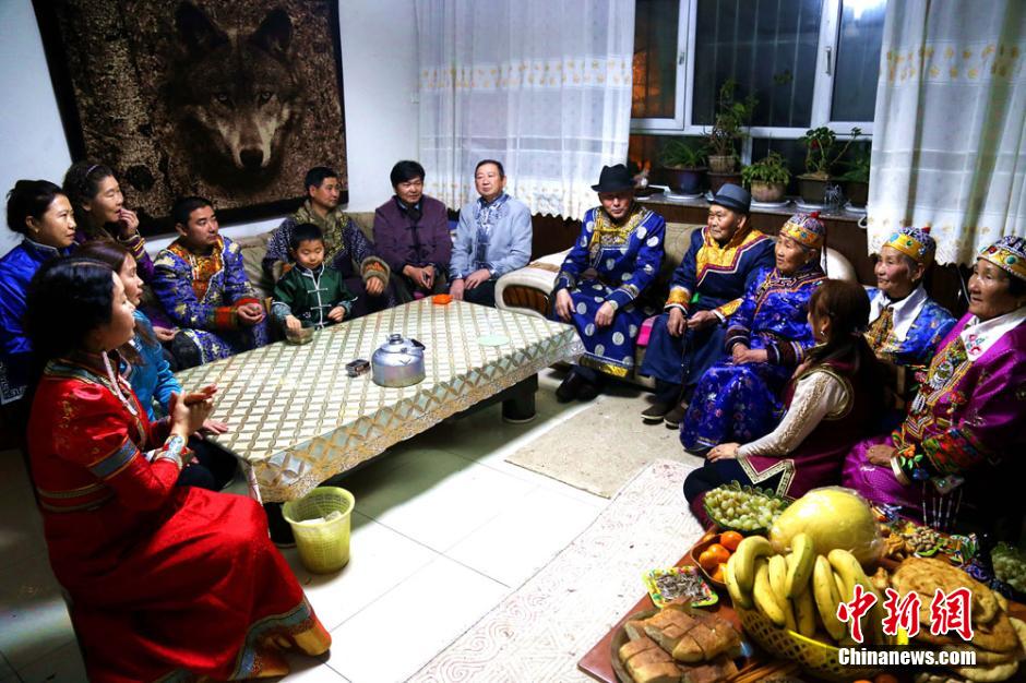 12月16日,在卫拉特蒙古族传统节日“祖鲁节”来临之际,博湖县芦花社区加娃老人一家身穿华丽的民族服饰,欢聚一堂,点燃祖鲁灯祈福幸福生活,共同欢庆节日的到来。