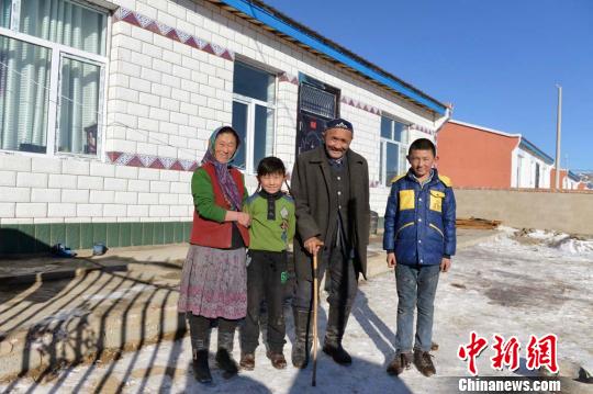 新疆哈密地区巴里坤县下涝坝乡,哈萨克族贫困牧民托哈什(右2)一家人搬迁入住新居。张建刚 摄