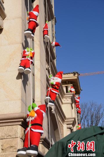 12月16日,山西太原,20余个“圣诞老人”爬在一小区大门外,成为一道有趣的风景。武俊杰 摄