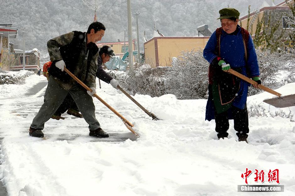 12月16日,一场大雪悄然降临至四川阿坝州理县,大地如同披上一层白纱,千树万树银装素裹,宛如一幅天然的水墨画,呈现出别样的美。图为村民自发清扫路上积雪。 万礼志 摄