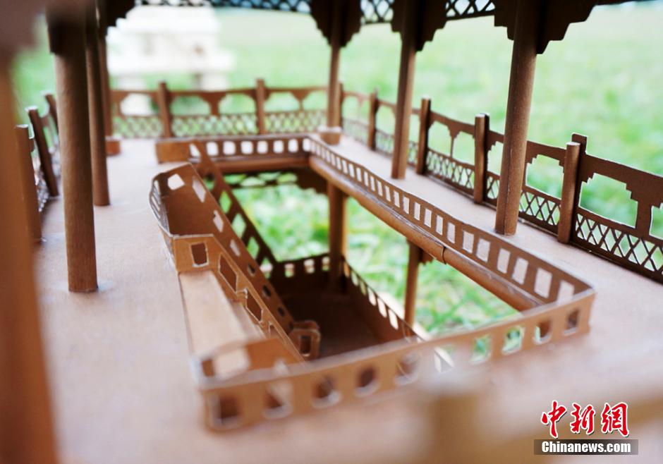 在四川大学锦江学院结构设计大赛上,该校工程造价专业的三个大二女生魏霜、张雅宜、黄培恒亲手设计、用4000根小木棍,经过上万次粘合造就了一栋小巧精致的超美别墅,引得围观师生纷纷点赞。图为川大锦江学院萌妹子巧搭“晓风亭”精致美观。 周玲玲 摄