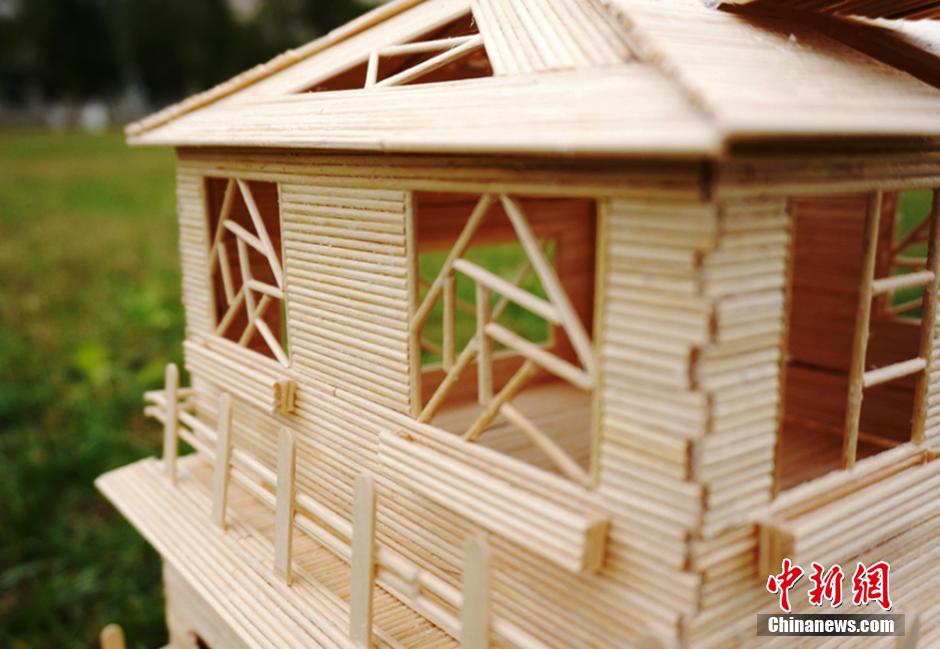 在四川大学锦江学院结构设计大赛上,该校工程造价专业的三个大二女生魏霜、张雅宜、黄培恒亲手设计、用4000根小木棍,经过上万次粘合造就了一栋小巧精致的超美别墅,引得围观师生纷纷点赞。图为独具匠心的窗框。 周玲玲 摄