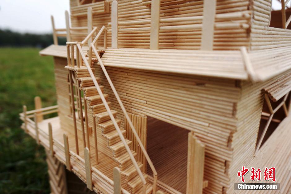 在四川大学锦江学院结构设计大赛上,该校工程造价专业的三个大二女生魏霜、张雅宜、黄培恒亲手设计、用4000根小木棍,经过上万次粘合造就了一栋小巧精致的超美别墅,引得围观师生纷纷点赞。图为精巧玲珑的迷你楼梯。 周玲玲 摄