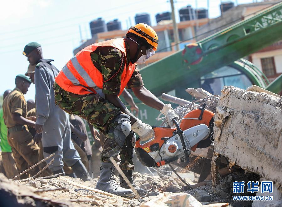 12月17日,在肯尼亚首都内罗毕,救援人员在事故现场切割楼板。