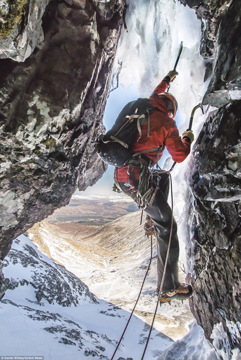 36岁的丹尼尔来自坎布尼亚,他说:“我曾在阿尔卑斯山和其他山脉上进行过很多次登山运动和冰坡攀登,但这是我第一次在大不列颠的冬天登山。与另外两位经验丰富的专业登山者一起我觉得很安全,但当处于高地时,那种与世隔离的孤独感仍然让人感到害怕。有一张照片是穿着绿色夹克的汤米正攀着岩石往上爬,我认为那张照片体现了登山的特点。它不是为了表明身体悬空时有多危险,而是显现出当在高原拍照留念的时候,记录下了我们当时害怕和恐惧的表情。”