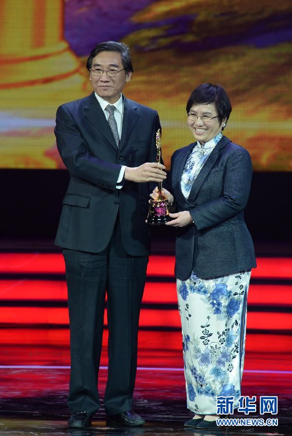 12月19日,人民日报社副总编辑陈俊宏(左)为获奖人吴永光颁奖。当日,“中华之光——传播中华文化年度人物”颁奖典礼在北京举行。据介绍,“中华之光——传播中华文化年度人物”评选活动由文化部、国务院新闻办、国务院侨办、中国人民对外友好协会等单位共同主办,每年举办一次,每次评选出10名“传播中华文化年度人物”和一个集体奖。新华社记者 陈晔华 摄