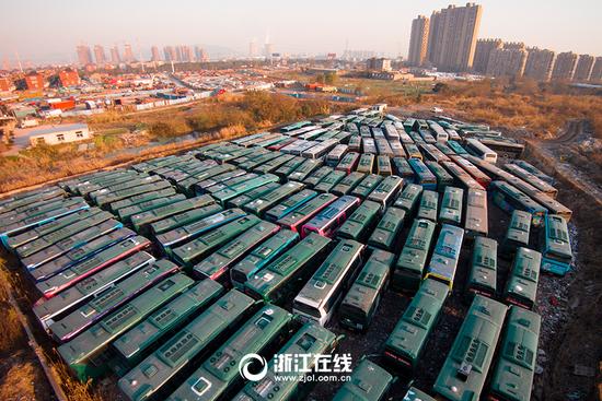 12月18日,记者在杭州南庄兜附近的一块荒地上找到了被戏称为“公交车坟场”的报废公交车停放点,从高空俯瞰,报废的公交车密密麻麻的停放着,颇有些凄凉。据看场地的陈师傅说,11月27日,有146辆报废公交车运到这里停放,他知道的公交车报废场还有2个,这些报废车的怎样处理他不是很清楚。浙江在线记者 王坚颖 倪雁强