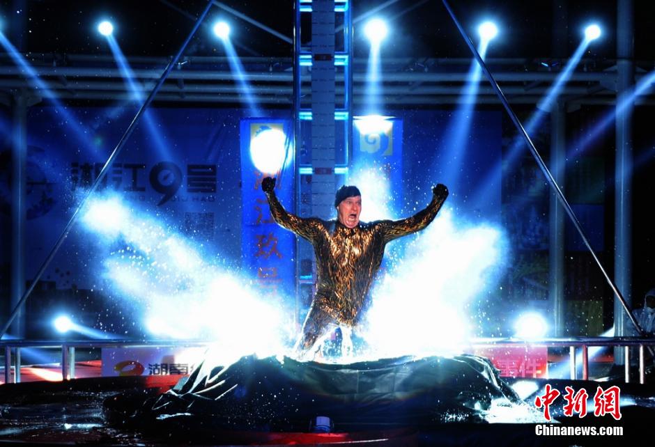 12月19日晚,一场惊心动魄的高空浅池极限跳水活动在长沙上演。53岁的美国人达伦·泰勒挑战人体极限,从9米高的跳台成功跃入仅29厘米深的水池,且池面铺满汽油,并燃起烈火。杨华峰 摄